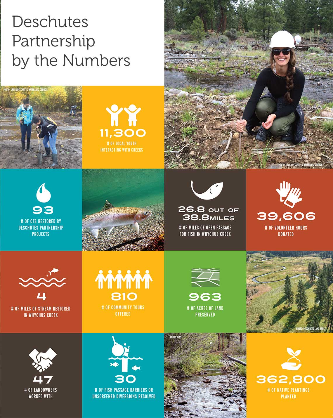Over the course of the past ten years, the four organizations that comprise The Deschutes Partnership have completed more than fifty projects in the Metolius River, Whychus Creek, and the lower Crooked River. This work includes noteworthy conservation achievements such as restoring Whychus Creek at Camp Polk Meadow Preserve, ensuring that Whychus Creek has live flow during summer months, establishing fish passage at the Three Sisters Irrigation District’s diversion, conserving one of the most ecologically significant private properties in the Metolius Basin, and addressing passage and screening at four large diversion structures on the mainstem Crooked River.