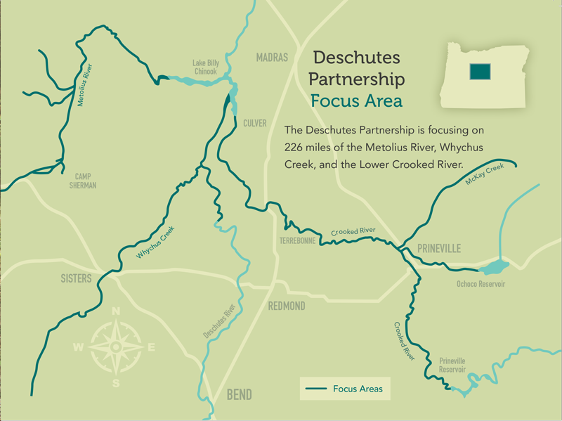 Since 2005, the Deschutes River Conservancy (DRC) and Three Sisters Irrigation District (TSID) have partnered to restore streamflow to Whychus Creek by piping TSID’s main canal, reducing seepage and evaporation loss. TSID dedicates the conserved water to instream use through Oregon’s conserved water statue. The resulting instream water helps meet DRC’s flow target – the state instream water right – from April to October each year and improves conditions for steelhead and redband trout.